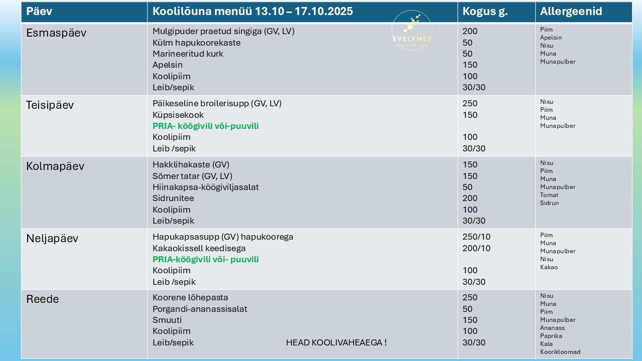 Menüü 13.10-17.10.2025