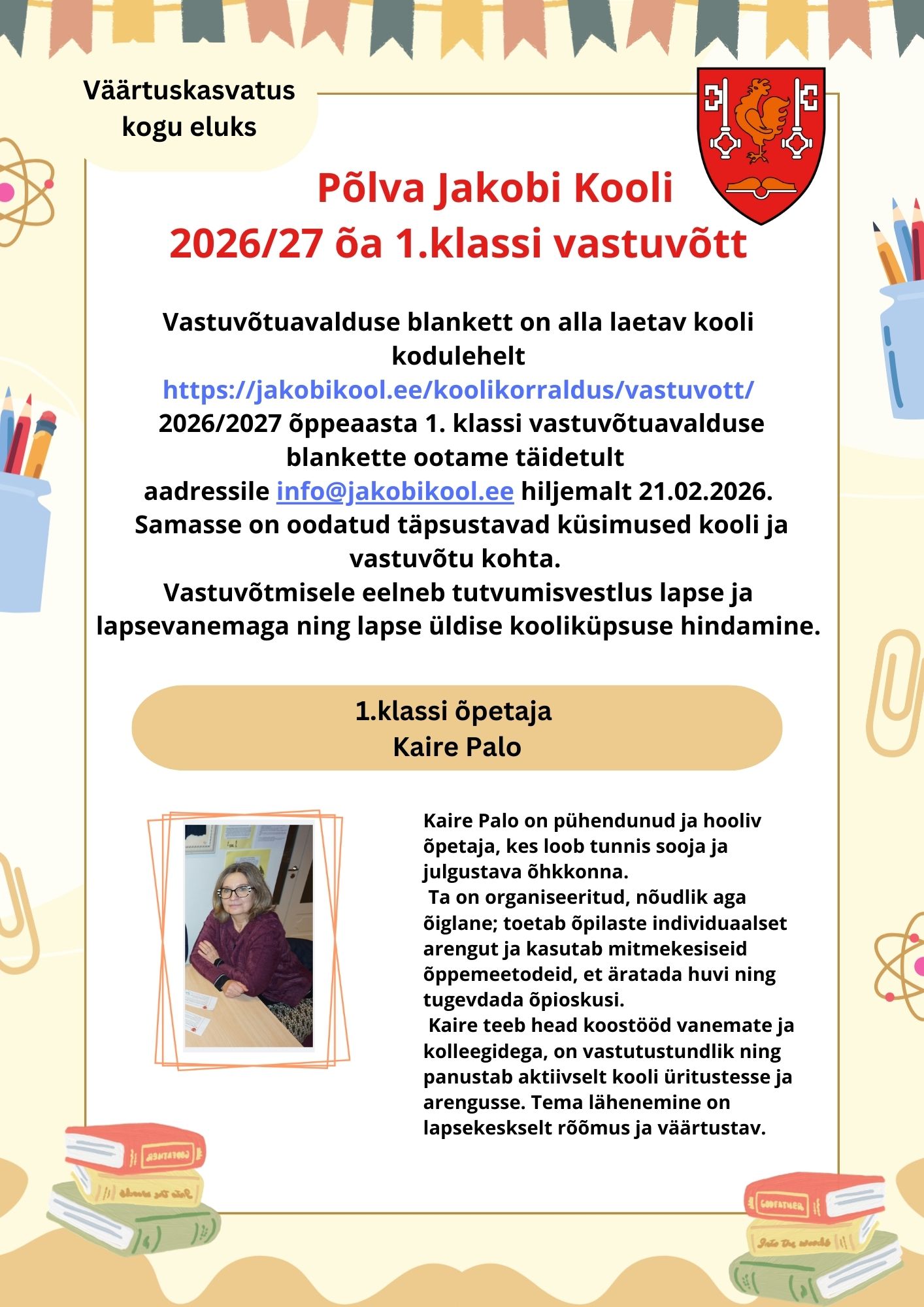 2026/2027 õppeaasta 1. klassi vastuvõtuavalduse blankette (lae fail siit) ootame täidetult aadressile info@jakobikool.ee. Samasse on oodatud täpsustavad küsimused kooli ja vastuvõtu kohta. Vastuvõtmisele eelneb tutvumisvestlus lapse ja lapsevanemaga ning lapse üldise kooliküpsuse hindamine.